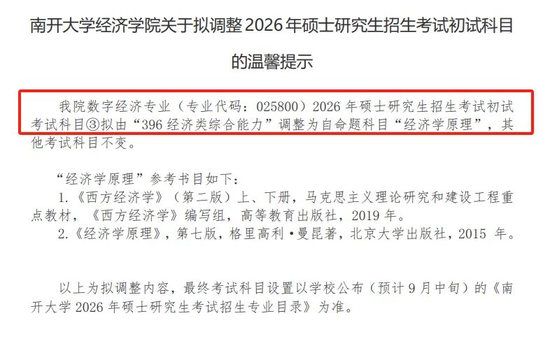 調(diào)整:南開大學(xué)2025年數(shù)字經(jīng)濟碩士考“396經(jīng)濟類綜合能力”,內(nèi)容包含高數(shù)部分,但是2026年調(diào)整為考“經(jīng)濟學(xué)原理”,不考數(shù)學(xué)了。