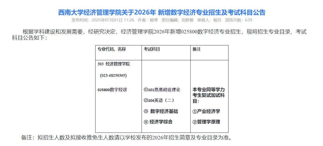新增:西南大學(xué)2026年新增數(shù)字經(jīng)濟碩士專業(yè),自命題科目分別是數(shù)字經(jīng)濟基礎(chǔ)和經(jīng)濟學(xué)綜合,不考數(shù)學(xué)。
