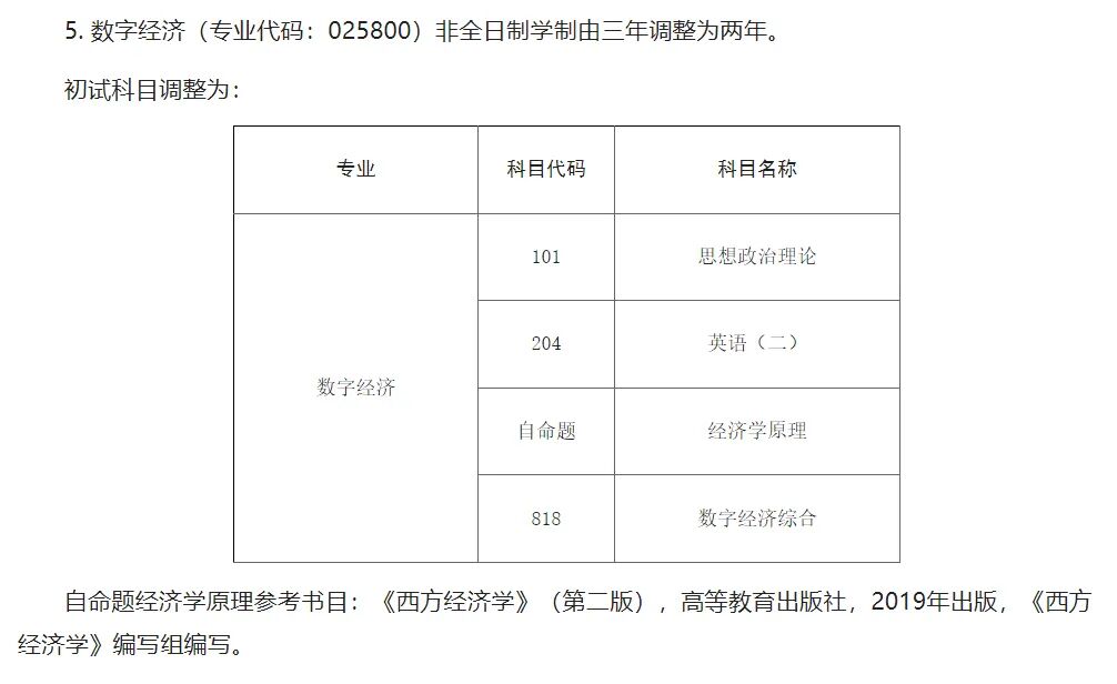 調(diào)整:對外經(jīng)濟貿(mào)易大學(xué)2025年數(shù)字經(jīng)濟碩士考“396經(jīng)濟類綜合能力”,內(nèi)容包含高數(shù)部分,但是2026年調(diào)整為考“經(jīng)濟學(xué)原理”,不考數(shù)學(xué)了。并且學(xué)制由三年調(diào)整為兩年。